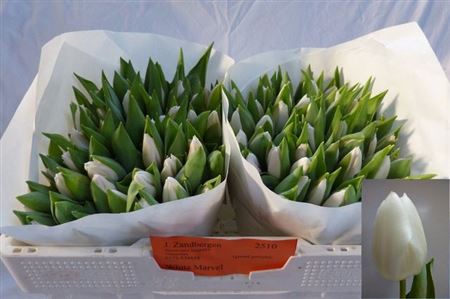 ≥ 50 stks -,- Colli 4 Bloemsteellengte 30 cm Inhoud 100 Gewicht (gr.) 20 Gram Aantal 400 Rijpheid 2-3 Fustcode 533 Land van herkomst NL Kwaliteit A1 Kweker Johan Zandbergen -,-≥ 50 stks -,-Tu En White Marvel - 30 Cm